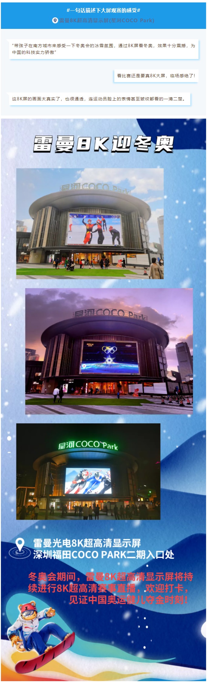 2021年底,工業(yè)和信息化部等六部門聯(lián)合部署開展“百城千屏”超高清視頻落地推廣活動(dòng),雷曼光電作為“百城千屏”項(xiàng)目認(rèn)證國內(nèi)8K LED顯示屏制作商及標(biāo)準(zhǔn)參編單位,以超高清技術(shù),助力北京冬奧會(huì)的內(nèi)容傳播,實(shí)現(xiàn)“8K看奧運(yùn)”目標(biāo)。