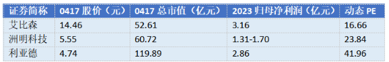 對于公司未來發(fā)展,艾比森方面頗具信心,公告披露的發(fā)展規(guī)劃顯示,公司將力爭2024年實現(xiàn)簽單80億元,2025年實現(xiàn)簽單100億元。市場亦對艾比森寄予高期待,申萬宏源證券報告顯示,預(yù)計公司 2023~2025 年歸母凈利潤分別為 3.23、4.69、6.35 億元,對應(yīng)同比增速分別為 58.9%、45.4%、35.4%。同時根據(jù) 3 家可比公司 2024 年平均市值加權(quán) PE,給予艾比森 2024 年動態(tài) PE 19.2 倍,對應(yīng)目標(biāo)市值 90.0 億元,目前上漲空間約40%。