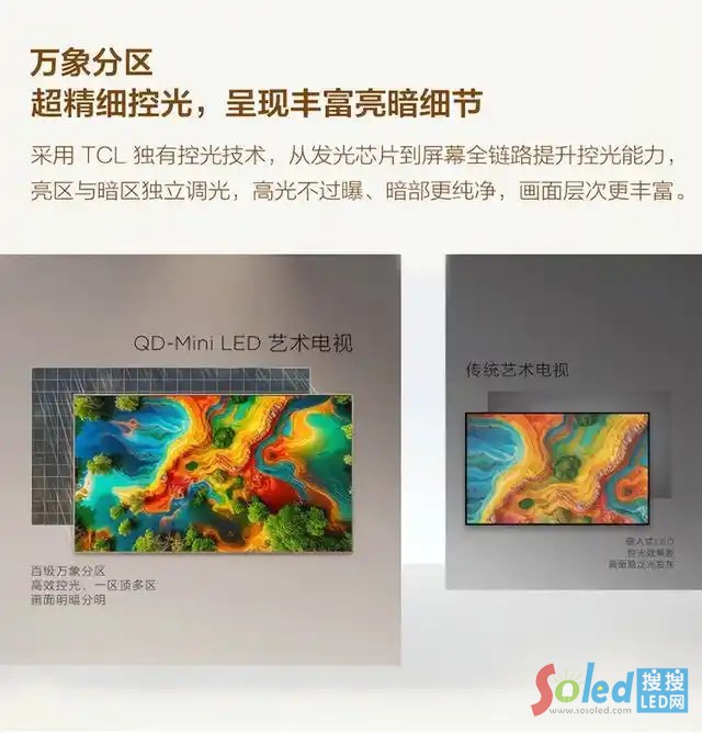區(qū)別于其他產(chǎn)品追求極致輕薄而犧牲畫質(zhì),A400 Pro并沒有在設(shè)計(jì)與畫質(zhì)之間妥協(xié),而是通過核心技術(shù)體系,讓藝術(shù)形態(tài)與優(yōu)異畫質(zhì)同步呈現(xiàn)。作為QD-Mini LED的開創(chuàng)者,TCL將Mini LED高分區(qū)精準(zhǔn)控光與量子點(diǎn)色彩增強(qiáng)技術(shù)融合,讓畫面既細(xì)膩真實(shí),又色彩飽滿,完美兼顧視覺美感與觀影體驗(yàn)。