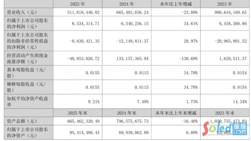 4月22日,聯(lián)建光電(300269)公布2025年年報(bào),公司營業(yè)收入為5.12億元,同比下降23.1%;歸母凈利潤為853萬元,同比上升34.6%;扣非歸母凈利潤自去年同期虧損1215萬元變?yōu)樘潛p863萬元,虧損額有所減少;經(jīng)營現(xiàn)金流凈額為-4085萬元,同比下降130.7%;EPS(全面攤薄)為0.0155元。